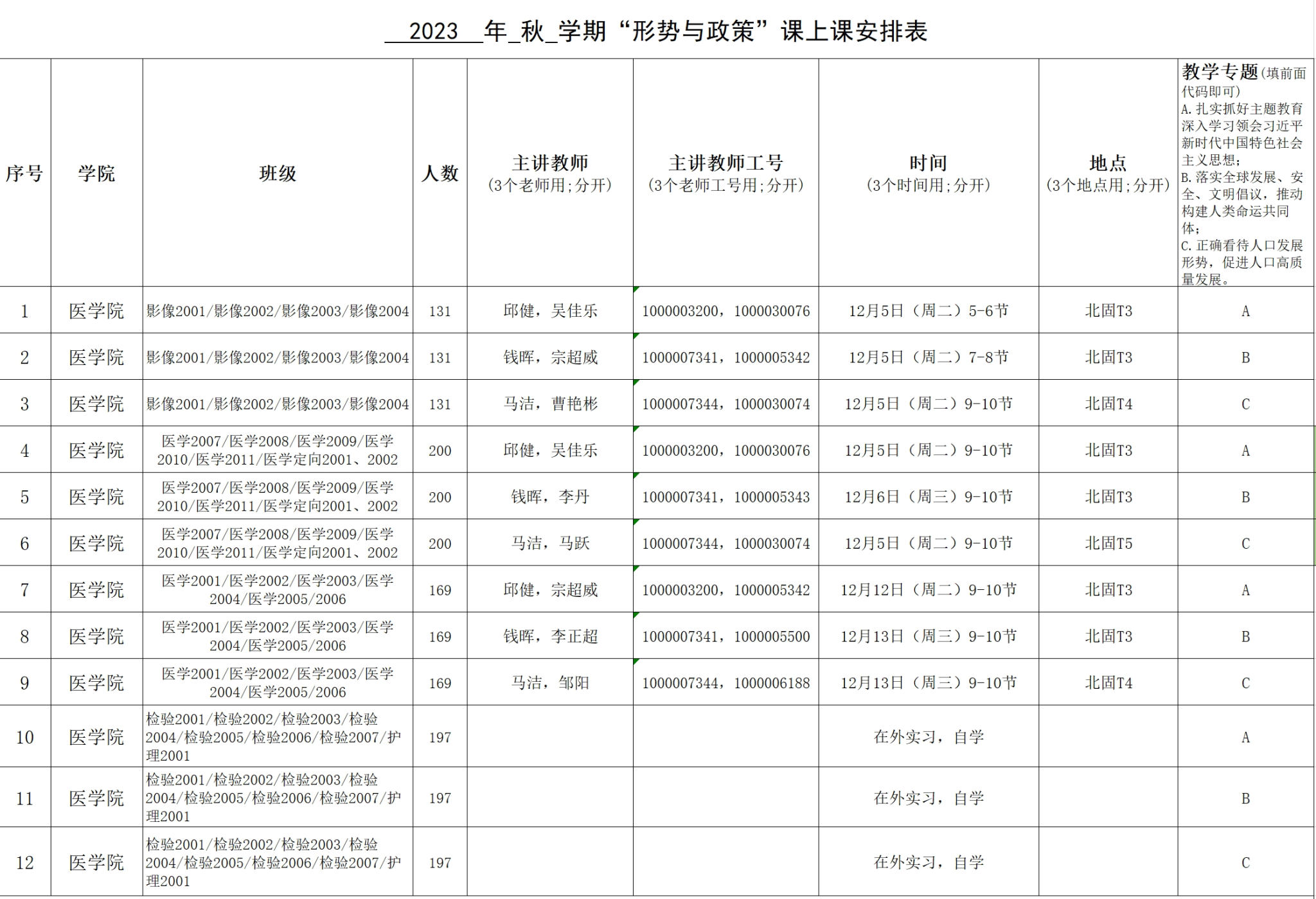 北固校区2023年秋学期“形势与政策”课上课安排表