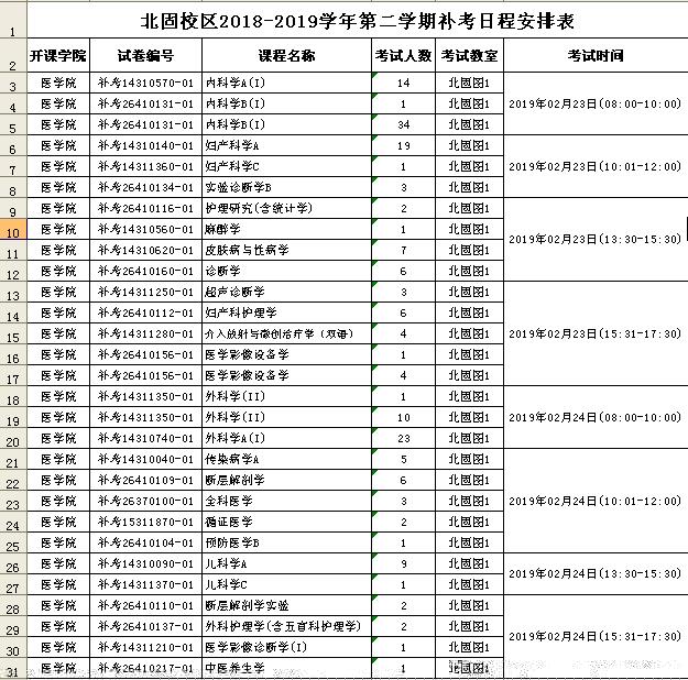 北固校区2018-2019学年第二学期补考日程安排表
