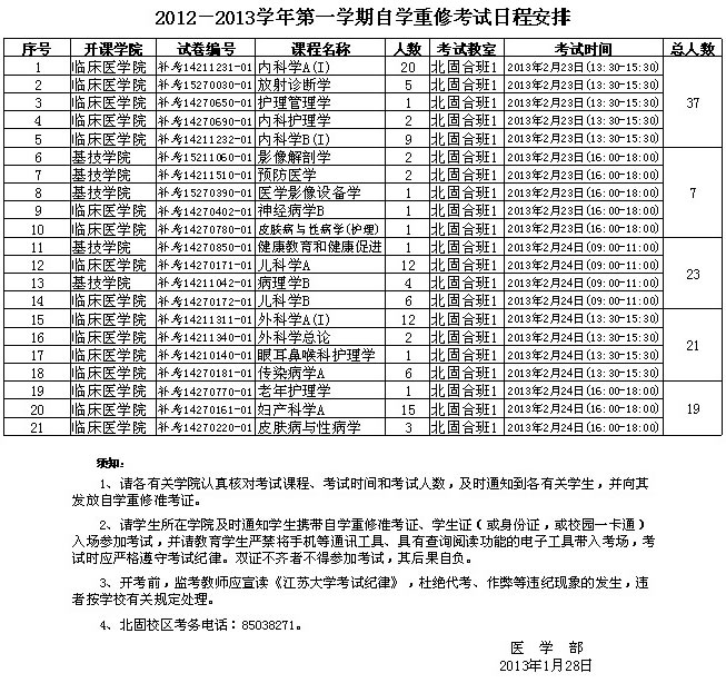 北固校区2012-2013学年第一学期自学重修考试日程安排
