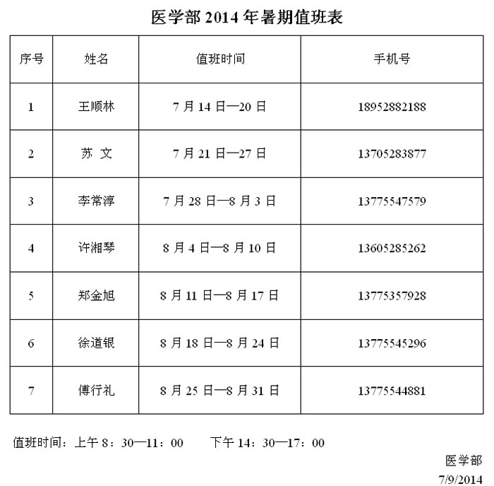 医学部2014年暑期值班表