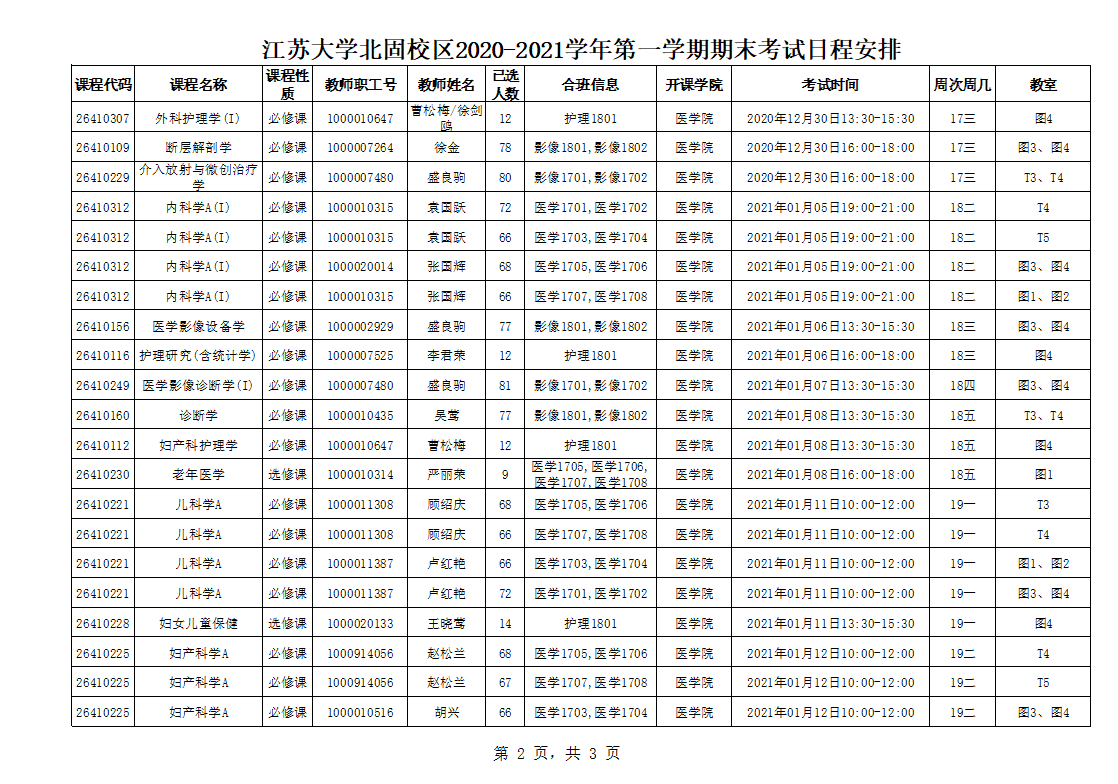 北固校区2020-2021学年第一学期期末考试安排
